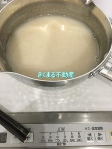 すると「あく」が少々出てきますので、スプーンで丁寧に取りますと、こんな感じ!